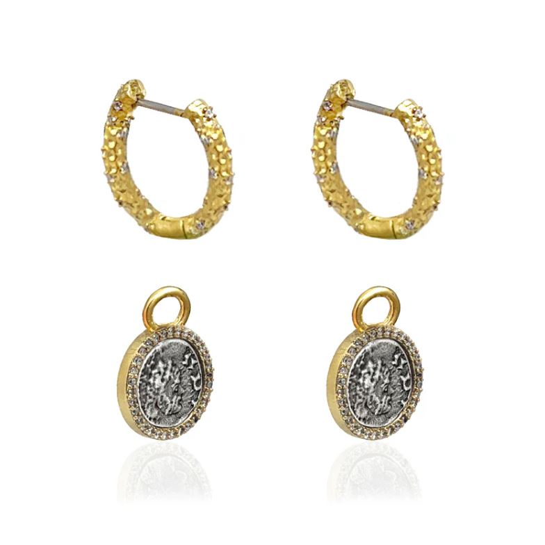 The Strati Di Monete collection showcases Tat2’s signature antique coins paired with hand-sculpted chains, perfect for refined layered looks. These 24K gold-plated huggie earrings feature a hammered texture and delicate clear CZ crystal accents. Each earring includes a .5" Dupré coin with a pavé CZ crystal bezel that can be worn as a removable dangle, offering two elegant styles in one. With a .75" hoop diameter, these versatile pieces elevate everyday wear with timeless sophistication.