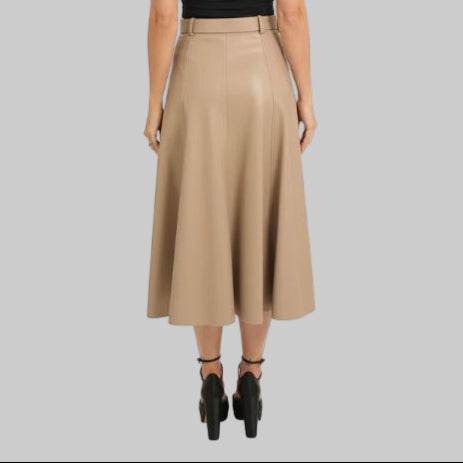 The Merceded Skirt in beige is a playful blend of edgy and feminine with its faux leather finish and flared, tulip-shaped panels. Featuring a faux leather belt with a buckle, this swing midi skirt adds a fun twist to your outfit while flattering your silhouette. Perfect for making a stylish statement, it’s designed to move with you and bring a fresh vibe to your wardrobe.