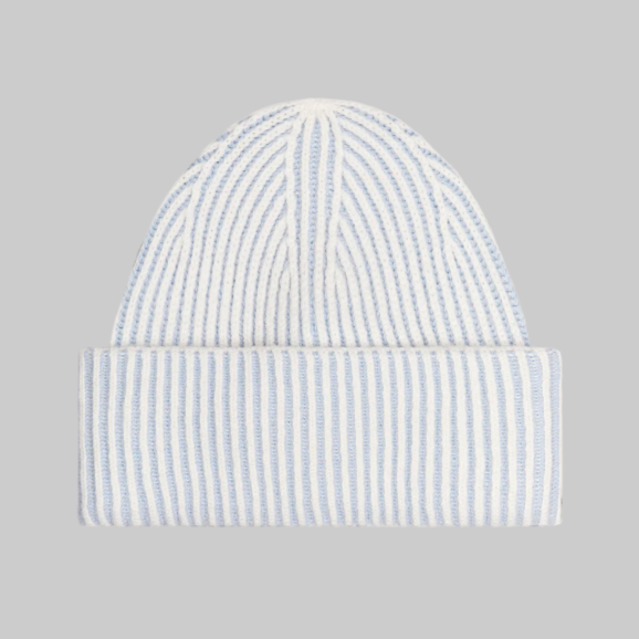 The Varley Dionne Plated Beanie in Mist Blue, crafted from a luxurious Alpaca blend yarn, features all-over rib stitching with tonal plating for a refined texture. Designed to complement the Deville scarf and Lauren knit tank, its deep turn-back and elegant rib detailing deliver warmth and style throughout the winter season. This beanie offers both cozy comfort and sophisticated grace, perfect for elevating your cold-weather wardrobe.