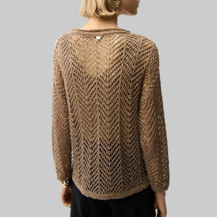 Elevate your wardrobe with this Joseph Ribkoff sequins yarn sweater, where refined elegance meets contemporary style. The chevron open stitch design creates visual interest while the shimmering sequin detailing adds a touch of glamour to everyday moments. Cut for a relaxed silhouette with a classic crew neck and long sleeves, this piece transitions seamlessly from casual daytime looks to sophisticated evening ensembles. The tiger's eye colorway provides a warm, versatile foundation that complements any palette. Perfect for those who appreciate understated luxury with just the right amount of sparkle.