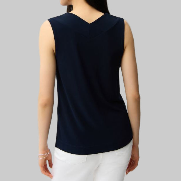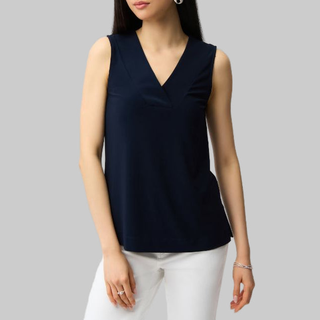 The Joseph Ribkoff Silky Knit Sleeveless Top in Midnight Blue is a versatile essential that transitions effortlessly from day to evening. Crafted from luxurious silky knit fabric, this piece delivers a refined drape and gentle comfort against the skin. The striking V-neckline adds contemporary sophistication, while the streamlined silhouette flatters any frame. Perfect for layering under blazers or wearing solo, this timeless top pairs beautifully with tailored trousers, skirts, or casual denim for an instantly polished look.
