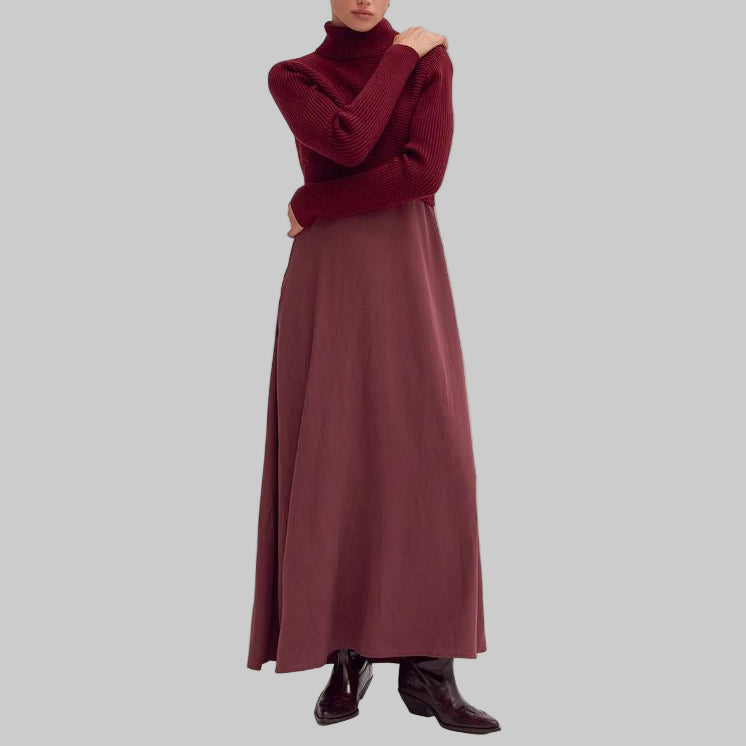 This elegant two-piece set combines a ribbed knit cropped turtleneck sweater with a sophisticated dress featuring striking contrast fabric play. The sweater's long sleeves and crossover front layer create dimensional styling, while the dress offers practical hidden side pockets and a discreet side zipper for effortless dressing. Perfect for layered looks that transition seamlessly from day to evening, this set delivers refined versatility with thoughtful design details.